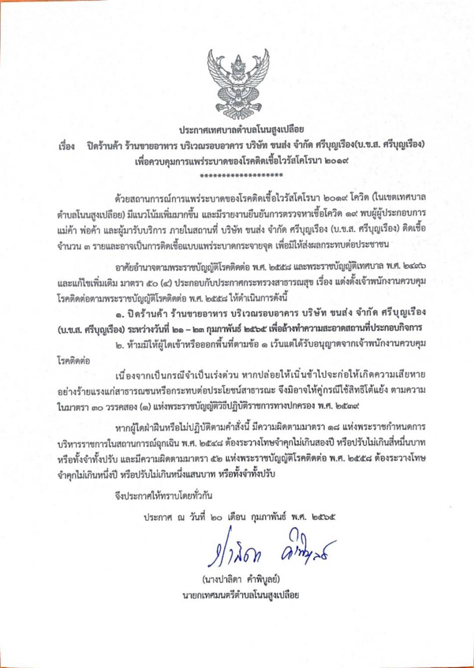 ประกาศปิดร้านค้า ร้านขายอาหาร บริเวณรอบอาคาร บริษัท ขนส่ง จำกัด ศรีบุญเรือง (บ.ข.ส.ศรีบุญเรือง) เพื่อควบคุมการแพร่ระบาดของโรคติดเชื้อไวรัสโคโรนา 2019 [21 กุมภาพันธ์ 2565]
