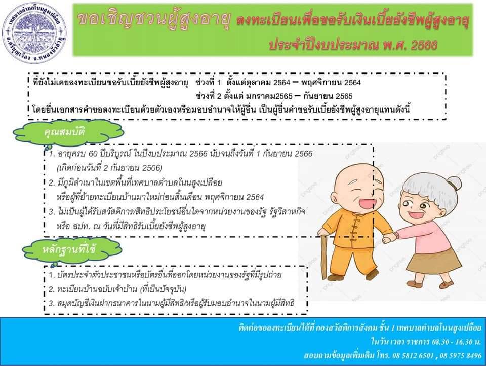 ขอเชิญชวนผู้สูงอายุ ลงทะเบียนเพื่อขอรับเงินเบี้ยยังชีพผู้สูงอายุ ประจำปีงบประมาณ พ.ศ.2566