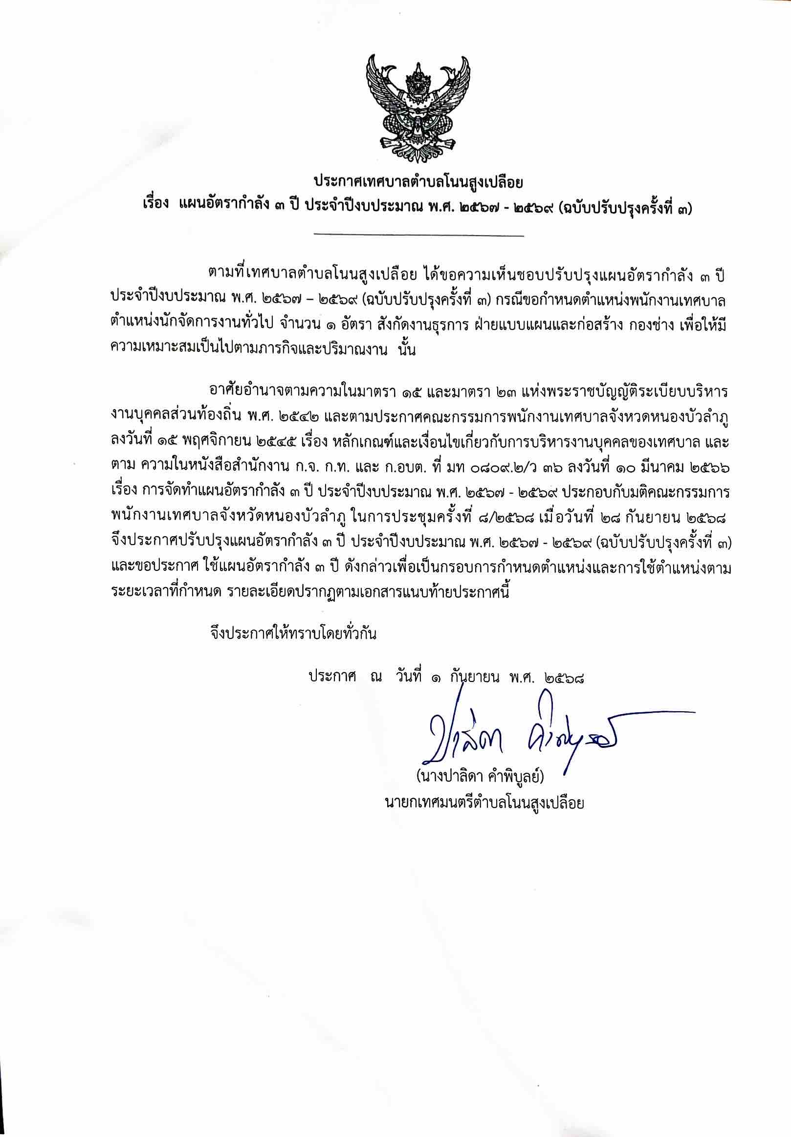 ประกาศเทศบาลตำบลโนนสูงเปลือย เรื่อง แผนอัตรากำลัง ๓ ปี ประจำปีงบประมาณ ๒๕๖๗ - ๒๕๖๙ (ฉบับปรับปรุงครั้งที่ ๓)