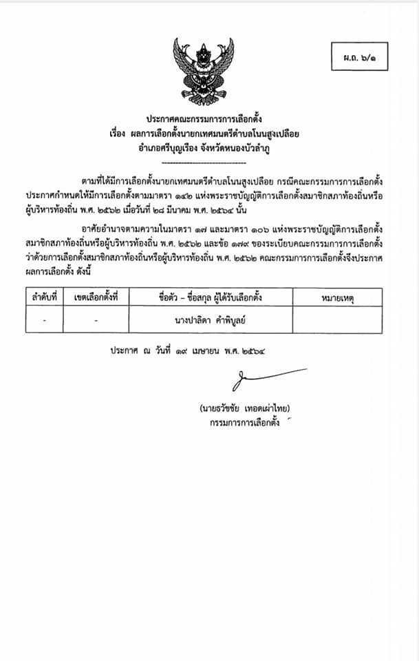 ประกาศคณะกรรมการการเลือกตั้ง เรื่อง ผลการเลือกตั้งสมาชิกสภาและนายกเทศมนตรีเทศบาลตำบลโนนสูงเปลือย อำเภอศรีบุญเรือง จังหวัดหนองบัวลำภู ลงวันที่ 19 เมษาย