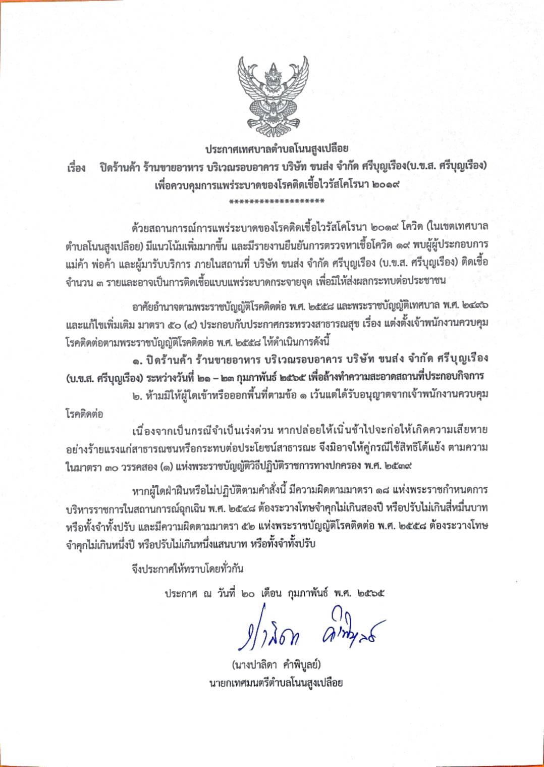 ประกาศปิดร้านค้า ร้านขายอาหาร บริเวณรอบอาคาร บริษัท ขนส่ง จำกัด ศรีบุญเรือง (บ.ข.ส.ศรีบุญเรือง) เพื่อควบคุมการแพร่ระบาดของโรคติดเชื้อไวรัสโคโรนา 2019