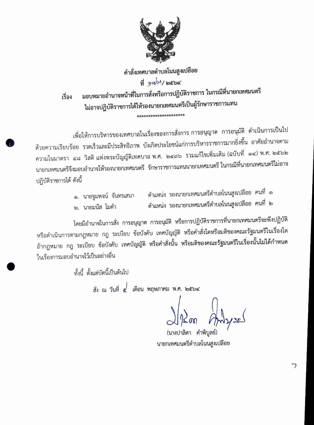 คำสั่ง เรื่องมอบหมายอำนาจหน้าที่ในการสั่งหรือการปฏิบัติราชการ ในกรณีที่นายกเทศมนตรีไม่อาจปฏิบัติราชการได้ให้รองนายกเทศมนตรีเป็นผู้รักษาราชการแทน