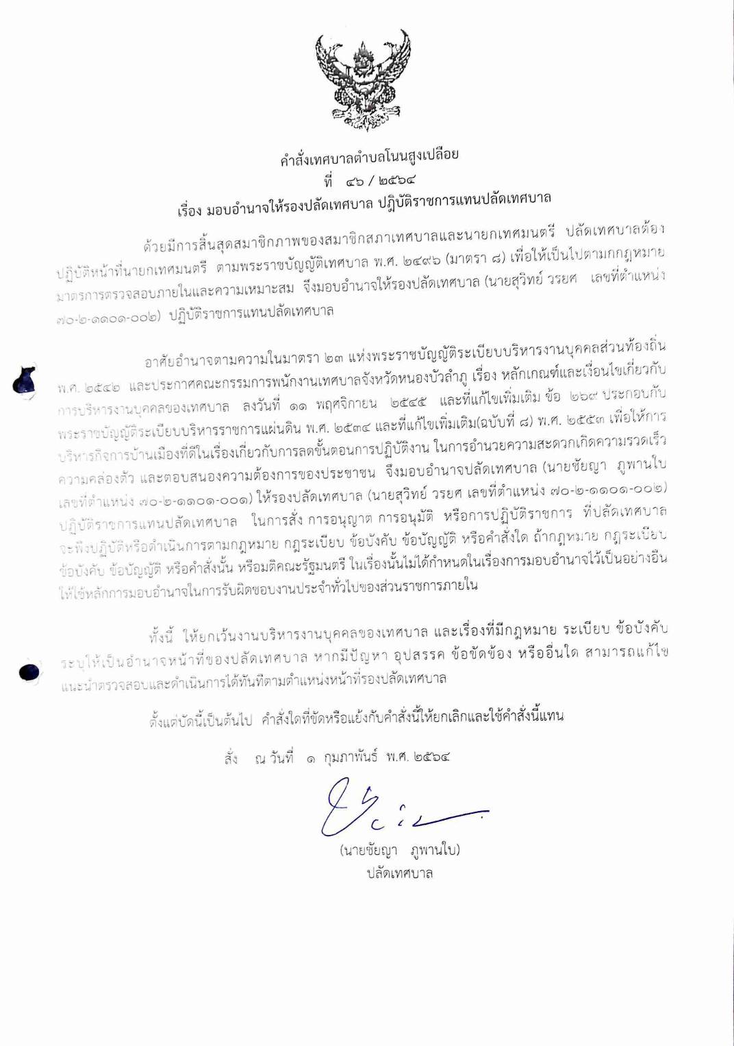 คำสั่ง เรื่องมอบอำนาจให้รองปลัดเทศบาลปฏิบัติราชการแทนปลัดเทศบาล