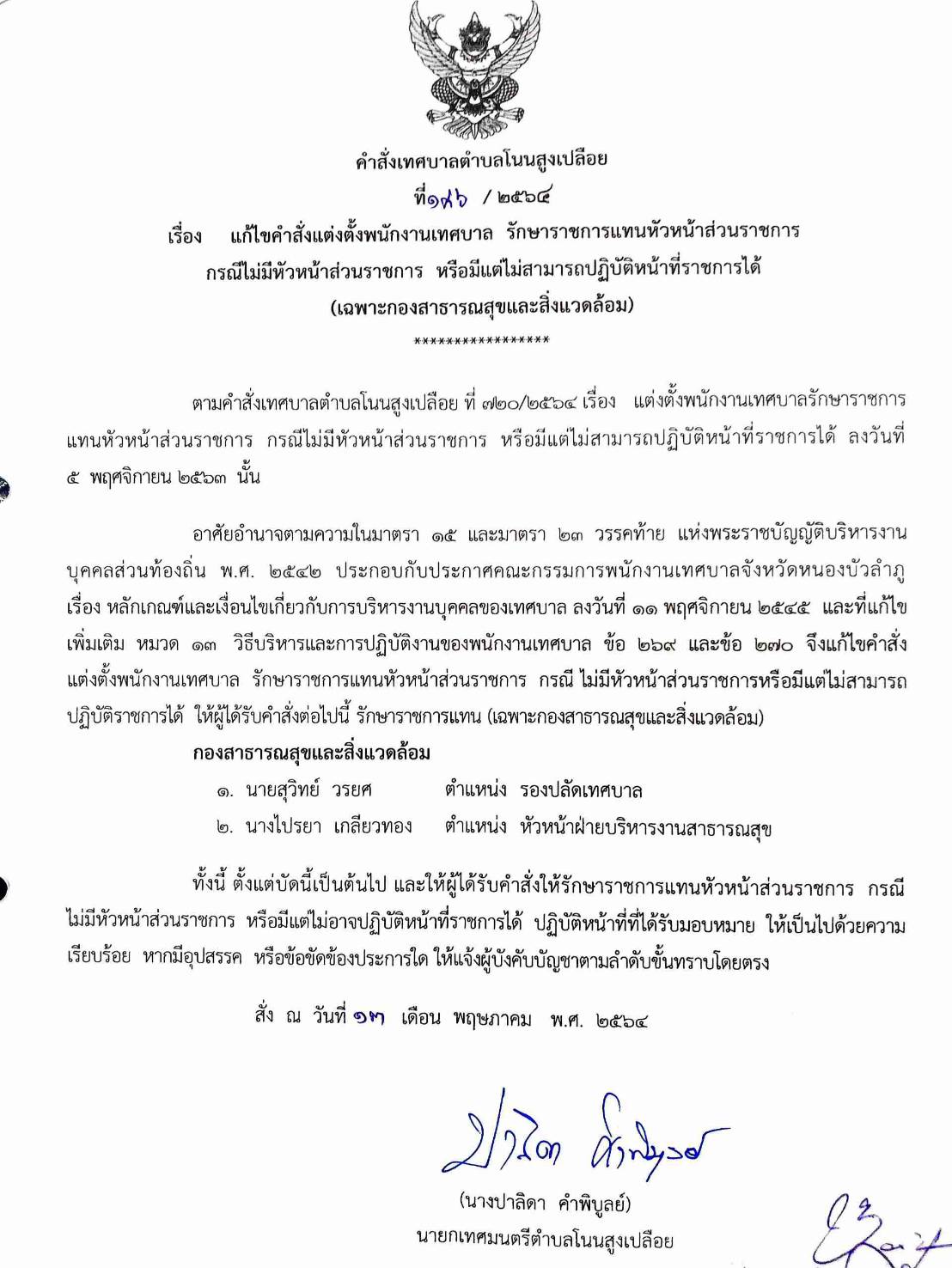 คำสั่ง เรื่องแก้ไขคำสั่งแต่งตั้งพนักงานเทศบาลรักษาราชการแทนหัวหน้าส่วนราชการ กรณีไม่มีหัวหน้าส่วนราชการ หรือมีแต่ไม่สามารถปฏิบัติหน้าที่ราชการได้เฉพาะ