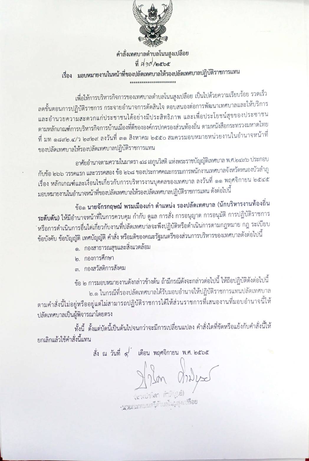 คำสั่ง เรื่องมอบหมายงานในหน้าที่ของปลัดเทศบาลให้รองปลัดปฏิบัติราชการแทน