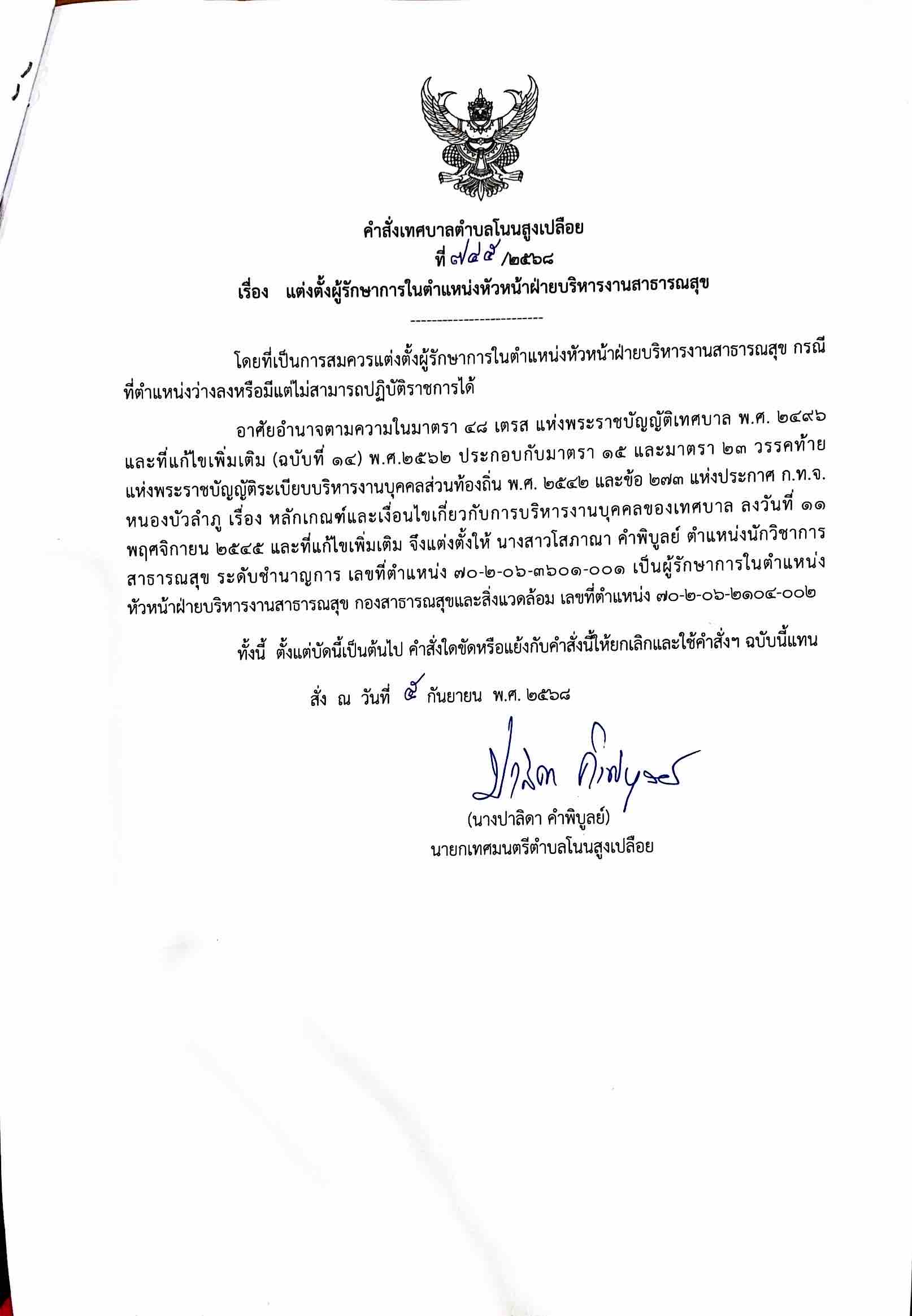คำสั่งเทศบาลตำบลโนนสูงเปลือย ที่ ๗๔๕/๒๕๖๘ เรื่องแต่งตั้งผู้รักษาราชการในตำแหน่งหัวหน้าฝ่ายบริหารงานสาธารณสุข